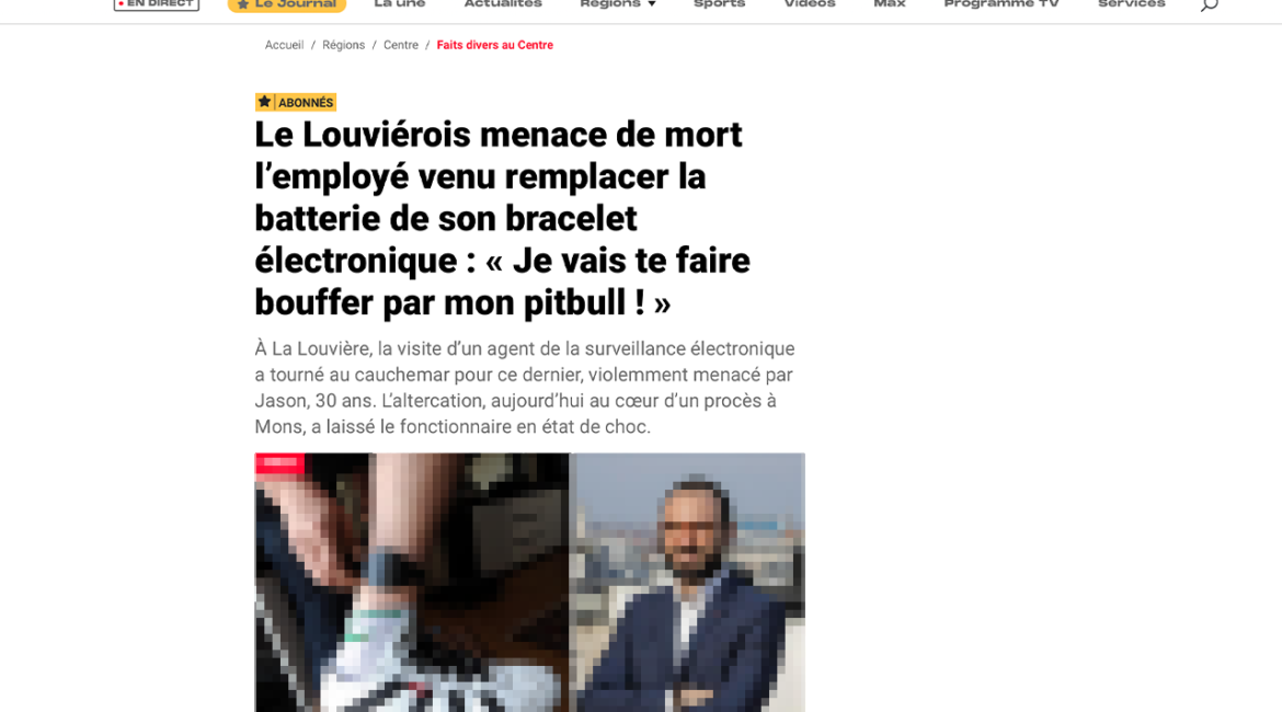 « Je vais te faire bouffer par mon pitbull ! »À La Louvière, un agent venu remplacer la batterie d’un bracelet électronique a été violemment menacé. Traumatisé, le fonctionnaire a porté plainte et l’affaire est aujourd’hui examinée par le tribunal de Mons. ✍️ Gisèle Maréchal. Le Louviérois menace de mort l’employé...